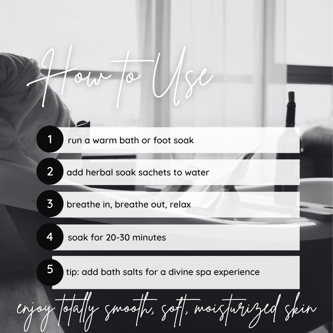 How to Use: Place one Botanical Soak Bag into warm running bath water. Let steep for several minutes. Squeeze gently to release the full spectrum of herbal benefits. Soak, breathe, and allow your body to fully unwind.