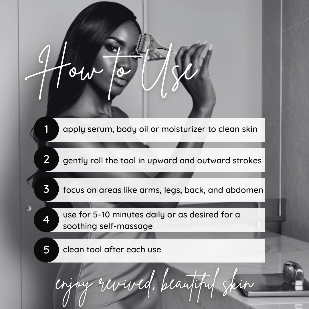 How to Use: Apply a body oil or moisturizer to clean skin. Gently roll the tool in upward and outward strokes across areas like the arms, legs, back, and abdomen. Use for 5–10 minutes daily or as desired for a soothing self-massage. Clean after each use.